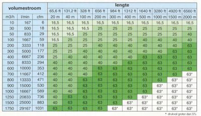 In functie van de overeenkomstige lengte van uw gesloten persluchtringleiding en gevraagde volumestroom, geeft de hieronder weergegeven tabel u de mogelijkheid de geadviseerde diameter te kiezen (waarden bij een druk van 8 bar een drukval van 5%). Op de verticale as staat de totaal geinstalleerde compressorcapaciteit die door de leidingen gaat, op de horizontale as de totale lengte van uw leidingsysteem.