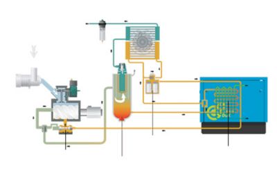 De olie in een oliegesmeerde schroefcompressor absorbeert de compressiewarmte. Vooraleer de hete olie naar de oliekoeler wordt geleid, wordt deze omgeleid door een warmtewisselaar in de Energy Box, waar de warmte wordt overgebracht naar een watercircuit.